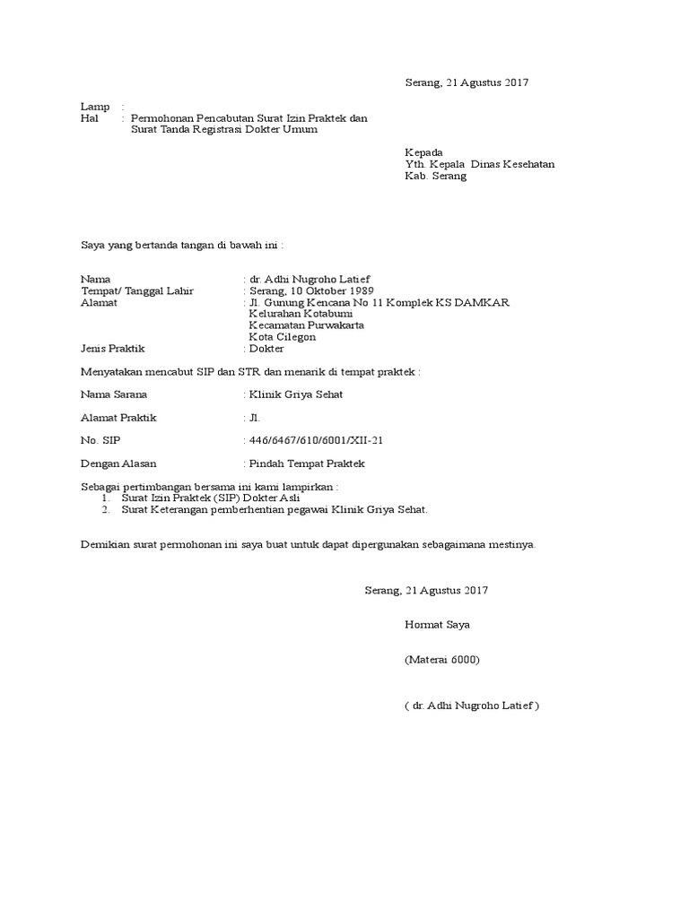 Surat permohonan pencabutan sip yang ditandatangani di atas materai rp. Contoh surat pencabutan kuasa yang benar reviewed by grobakz on wednesday may 6th 2015. Demikian contoh dan format penulisan surat keterangan praktek dokter gigi di sebuah klinik di wilayah madiun jawa timur. Klik download di bawah tulisan verification code. Surat pernyataan memiliki tempat praktik atau surat keterangan dari sarana pelayanan kesehatan sebagai tempat praktiknya surat persetujuan dari atasan langsung bagi dokter dan dokter gigi yang bekerja pada instansi fasilitas pelayanan kesehatan pemerintah atau pada instansi fasilitas kesehatan pelayanan kesehatan lain secara purna waktu. Bekasi 4 mei 2017 hormat saya dr.