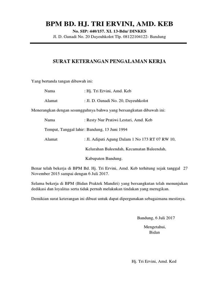 Contoh surat pengalaman kerja bidan. Surat pengalaman kerja ini berguna sebagai bukti bahwa seseorang itu sudah memiliki pengalaman kerja di bidang tertentu sesuai dengan yang tertera pada surat pengalaman kerja. Sama dengan surat lamaran kerja pada umumnya surat lamaran kerja bidan ditulis atau dibuat untuk memenuhi persyaratan kerja sebagai seorang bidan di lembaga kesehatan yang sedang membuka lowongan kerja untuk bidan. Contoh surat pengalaman kerja surat pengalaman kerja ini sangat diperlukan dalam melamar pekerjaan baru. Surat pengalaman kerja adalah surat yang dikeluarkan oleh suatu instansi atau perusahaan tertentu yang isinya menerangkan bahwa seseorang pernah bekerja pada instansi atau perusahaan tersebut dalam satu periode kerja tertentu. Jadi simak pemaparan kami tentang surat pengalaman kerja sampai akhir ya. Terlebih pada saat ini persaingan dalam dunia pekerjaan sangat ketat.