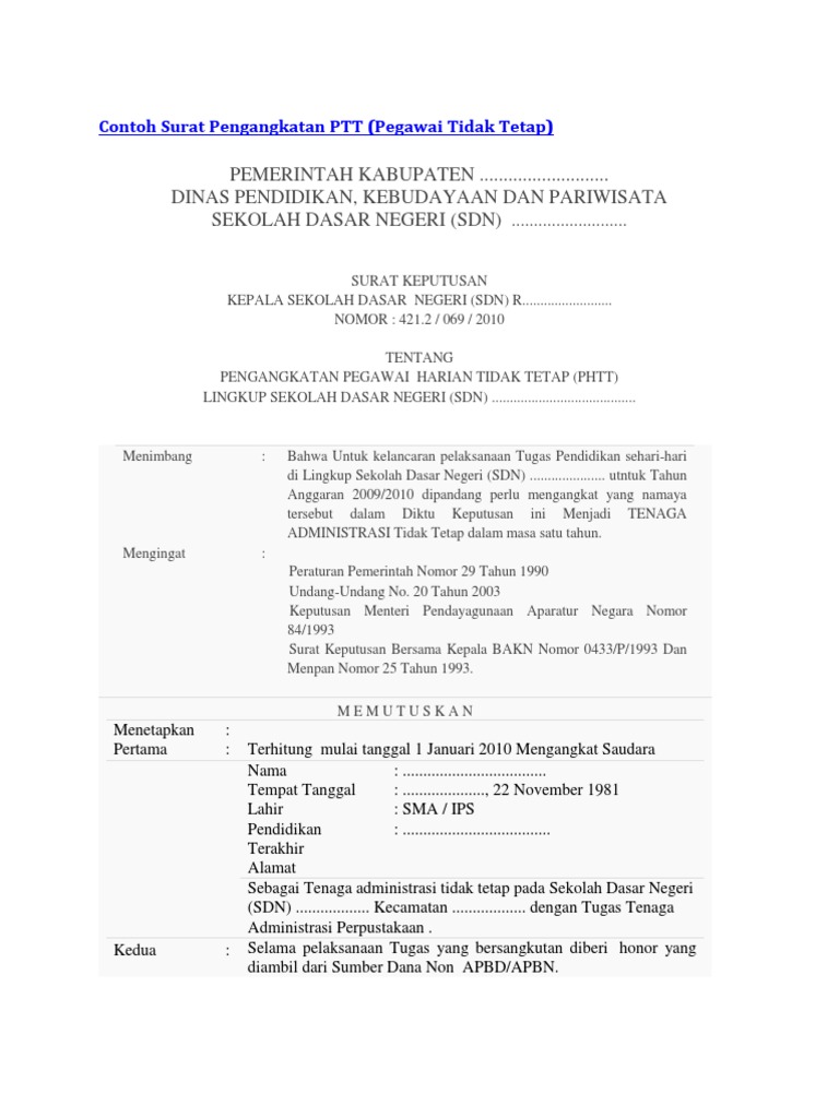 Contoh surat keputusan sk pengangkatan karyawan tetap ketika seorang karyawan borongan karyawan tidak tetap dinilai berprestasi dan memenuhi kriteria yang diinginkan perusahaan maka dapat diangkat menjadi karyawan tetap. Simpan simpan contoh surat pengangkatan karyawan tetappdf untuk nanti 4 4 mendukung tandai dokumen ini sebagai bermanfaat 2 2 menolak tandai dokumen ini sebagai tidak bermanfaat tanamkan bagikan. Ya ada banyak perusahaan yang mempekerjakan karyawan dengan status kontrak. Surat keputusan diperlukan bilamana seorang pemimpin atau atasan membuat keputusan di suatu pihak atau kelompok. Bila anda ingin mendownload contoh surat pengangkatan karyawan dalam format doc silahkan klik link berikut ini. Download contoh surat pengangkatan karyawan doc.