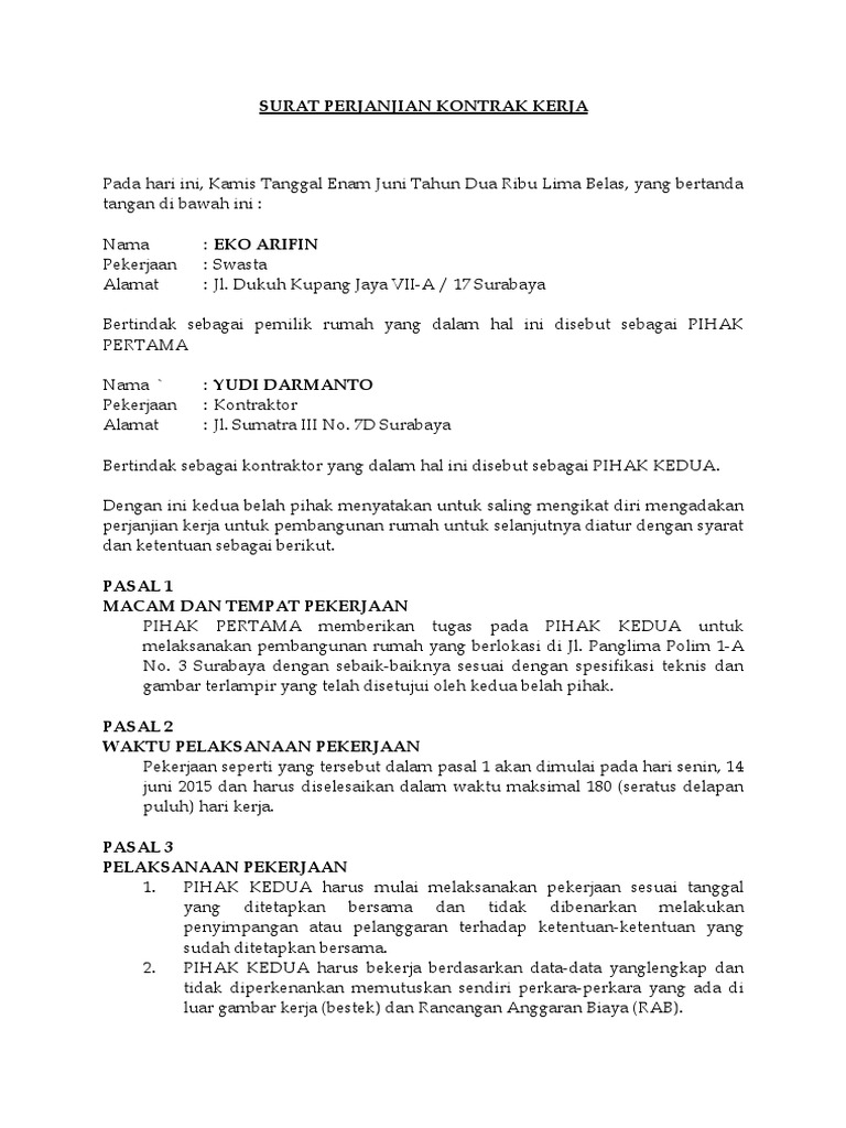 Supervisor kredit dalam hal ini bertindak untuk dan atas nama pt. Kontrak kerja adalah sebuah surat yang berisikan perjanjian atau kesepakatan sistem kerja antara karyawan dengan perusahaan tertentu. Yang dimaksud dengan perjanjian kerja sama pelaksanaan konstruksi adalah perjanjian pelaksanaan proyek pembangunan rumah. Bertinak sebagai pemilik rumah dan selanjutnya akan di sebut sebagai pihak pertama. Melalui kontrak terciptalah perikatan atau hubungan hukum yang menimbulkan hak dan kewajiban pada masing masing pihak yang membuat kontrak. Surat perjanjian kerja paruh waktu.