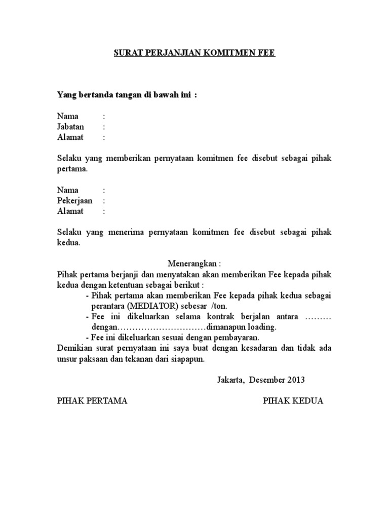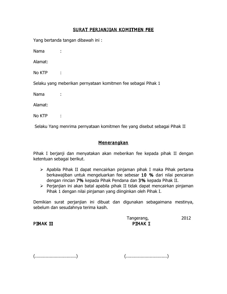 Untuk memperkuat pelaksanaan pemberian insentif atau fee tersebut perlu adanya kekuatan hukum yang mengikat. Academiaedu is a platform for academics to share research papers. Telp085249779238 atau 05113257783 selaku yang menerima pernyataan komitmen fee disebut sebagai pihak kedua. Demikian surat perjanjian ini dibuat untuk menjadi pokok dasar dalam melaksanakan tugas kewajiban dan tanggung jawab sebagaimana telah diatur dalam surat perjanjian ini. Jika anda menjadi mediator atau jasa perantara jual beli biasanya akan mendapat fee ataupun uang komisi dari pihak penjual. Surat perjanjian komitmen fee.