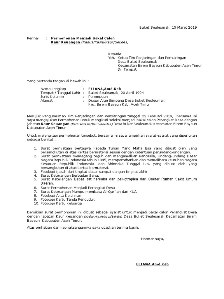 Contoh surat permohonan menjadi pemateri seminar pelatihan acara. Contoh surat permohonan menjadi bakal calon perangkat desa atau sekretaris desa berdasarkan peraturan bupati kendal no51 tahun 2017 pasal 12 ayat 2. 15 contoh surat permohonan rekomendasi paling lengkap ada banyak contoh surat yang masih dipergunakan sekarang ini baik itu untuk kepentingan pribadi maupun untuk kepentingan kelompok. Jangan pernah meremehkan aparat desa karena desa tanpa alat desa tidak akan bisa berjalan lancar. Contoh surat lamaran perangkat desa contoh surat lamaran perangkat desa 2020 surat permohonan menjadi perangkat desa doc dan pdf dalam pengisianseleksi penjaringan jabatan perangkat desa salah satu syarat administrasi yang harus dilengkapi oleh bakal calon perangkat desa adalah surat lamaransurat permohonan. Contoh format surat permohonan pencalonan perangkat desa untuk segala posisi hal hal yang mesti terdapat pada surat sah pada umumnya pun harus terdapat pada surat permohonan.