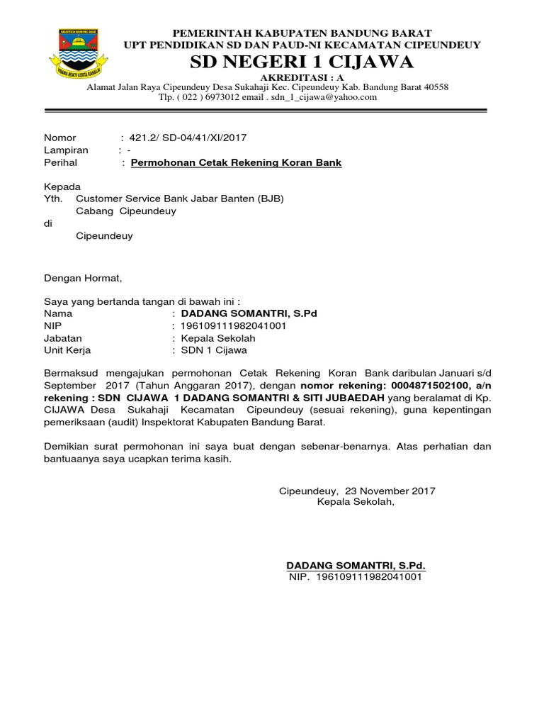 Demikian surat permohonan ini saya buat dengan sebenar benarnya dan dipergunakan sebagaimana mestinya untuk keperluan di atas. Mohon maaf apabila terdapat kesamaan namatempatinformasi lain karena surat yang dibuat hanya bertujuan sebagai percontohan tanpa ada maksud apapun. Contoh surat permohonan kepada bank perihal pencetakan rekening koran dan permintaan surat keterangan bank bank reference menyiapkan dokumen yang diperlukan untuk aplikasi uk visa memang sedikit ribet terutama dokumen mengenai bukti danauang yang kita miliki. 02 desa karamatwangi kecamatan cikajang sesuai rekening guna kepentingan pemeriksaan audit inspektorat kabupaten garut. Contoh surat permohonan bila mengurus sebuah berkas apalagi berhubungan dengan bank pasti kita merasa canggung dan tidak biasa menghadapi yang namanya instansi yang resmi. Biasanya persyaratan yang diminta adalah menyertakan berbagai dokumen yang dinilai bisa memberi informasi dan menggambarkan kondisi finansialnya seperti surat pemberitahuan spt pajak penghasilan pph 21 slip gaji surat pajak bumi dan bangunan pbb serta daftar riwayat transaksi selama 3 atau 6 bulan terakhir yang bisa kita dapat dari percetakan rekening koran.