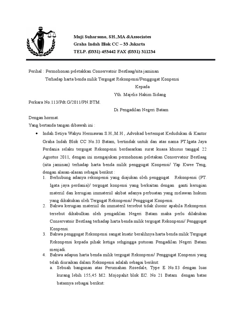 Contoh surat permohonan sita jaminan. Nama kota tgl bln thn. Memerintahkan kepada panitera atau jika dia berhalangan seorang penggantinya yang sah dengan dibantu oleh dua orang saksi yang telah dewasa dan dikenal untuk meletakkan sita jaminan atas barang barang milik bersama guna menjamin gugatan penggugat sebagaimana telah dijelaskan dalam gugatan. Jika terdapat persangkaan yang beralasan bahwa seorang yang berhutang selagi belum dijatuhkan keputusan atasnya atau selagi putusan yang mengalahkannya belum dapat dijalankan mencari akal akan menggelapkan atau membawa barangnya baik yang tidak tetap maupun yang tetap. Di atas merupakan bagian terpenting dan yang tidak dapat dipisahkan dari akta perjanjian kredit dengan pemberian jaminan surat perjanjian. Dalam rangka eksekusi dilarang untuk menyita hewan atau perkakas yang benar benar dibutuhkan oleh tersita untuk mencari nafkah pasal 197 8 hir 211 rbg. Mengabulkan sita jaminan yang dimohonkan oleh penggugat.