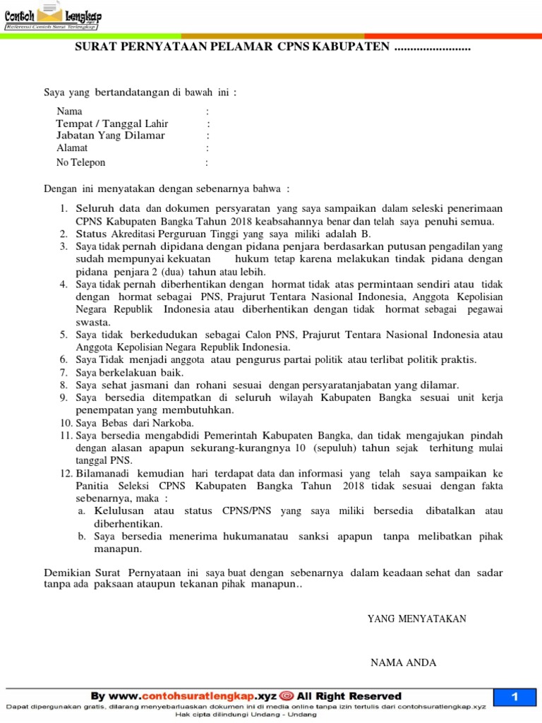 Contoh surat pernyataan cpns 2018. Dapatkan file contoh surat pernyataan cpns 2018 yang tidak diproteksi dalam bentuk word doc mudah di edit dan siap print di situs wwwcontohsuratlengkapxyz. Berikut ini adalah contoh surat pernyataan yang bisa kalian pakai untuk melamar pekerjaan sebagai contoh di perusahaan swasta seleksi cpns seperti saat ini sedang dibuka seleksi cpns 2018 maupun di bumn. Ayo di download contoh surat lamaran pernyataan cpns 2018juga contoh dokumen persyaratan dan pengumuman alokasi formasi cpns 2018. Di surat pengumuman itu dijelaskan bahwa surat pernyataan diketik menggunakan komputer bermaterai rp6000 dan ditandatangai dengan pena berwarna hitam. Untuk anda yang sedang bingung bagaimana bentuk dan format surat pernyataan dala mmelamar cpns di bawah ini kami sediakan contoh surat pernyataan cpns untuk lulusan sma di salah satu kementerian yang kebetulan di tahun 2019 ini sedang membuka pendaftaran cpns. Contoh surat lamaran cpns 2018download contoh surat lamaran cpns guru 2018.