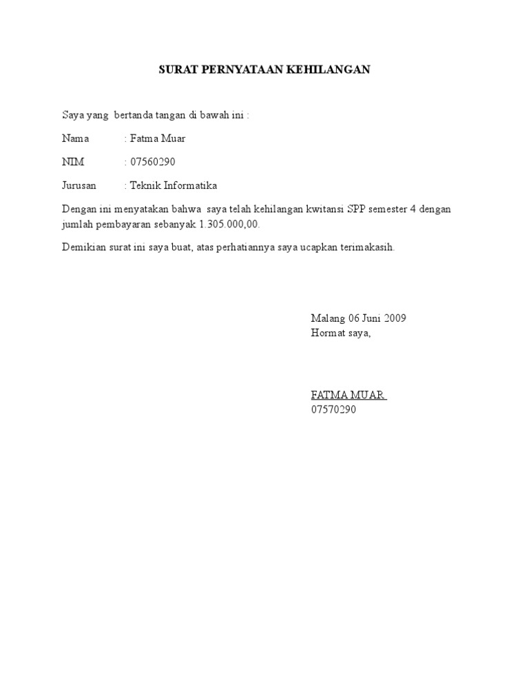 Setiap musibah yang datang memang tak dapat kita hindari dan itupun bukan atas kehendak kita. Contoh surat pernyataan secara umum surat pernyataan merupakan jenis surat yang dibuat oleh individu yang menyatakan dirinya atau dibuat untuk orang lain yang pernah atau tidak pernah melakukan sesuatu. Surat pernyataan kehilangan stnk berikut ini anda bisa lansung copypaste contoh surat pernyataan kehilangan stnk bpkb sim ini untuk kelengkapan. Berikut ini contoh format surat kehilangan yang dapat dipelajari. Jakarta 11 januari 2018 kepada yth toko sportskita jakarta barat. Skripsi spp semester iii rp 1400000 demikian surat pernyataan ini kami buat untuk menjadikan periksa adanya terimakasih wasalamualaikum.