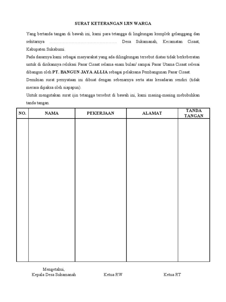 Berikut kami lampirkan contoh dari bentuk surat permohonan persetujuan warga yang ditujukan ke rtdan rw serta bentuk form tanda tangan warga. Contoh surat pernyataan no. Pernyataan yang diberikan secara lisan sering kali sulit untuk diingat dengan secara rinci. Surat kesepakatan bersama bukan hanya biasanya dibuat oleh perusahaan melainkan juga biasanya dibuat oleh seseorang yang berkeinginan untuk melakukan perjanjian atau kesepakatan kerjasama demi mencapai keuntungan dan tujuan bersama. Selanjutnya berbekal surat izin yang telah ditandatangani oleh rt dan rw tadi kita door to door ke rumah warga sekitar untuk meminta persetujuan mereka tentang rencana pendirian sekolah tk paud atau tpq.