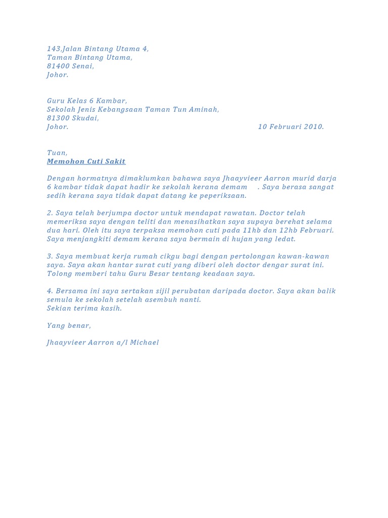Contoh surat sakit untuk sekolah kedua. Carian contoh surat rasmi tidak hadir ke sekolah. Surat tidak hadir ke sekolah cuti sakit harun bin rashid no. Jika contoh tersebut tidak cukup kami berikan contoh surat izin sakit yang kedua berikut ini. 34 jalan mohd salleh lorong abdullah 85000 muar johor bahru johor. Contoh surat sakit sekolah di atas bisa dibilang sangat sederhana dan mudah untuk dibuat.