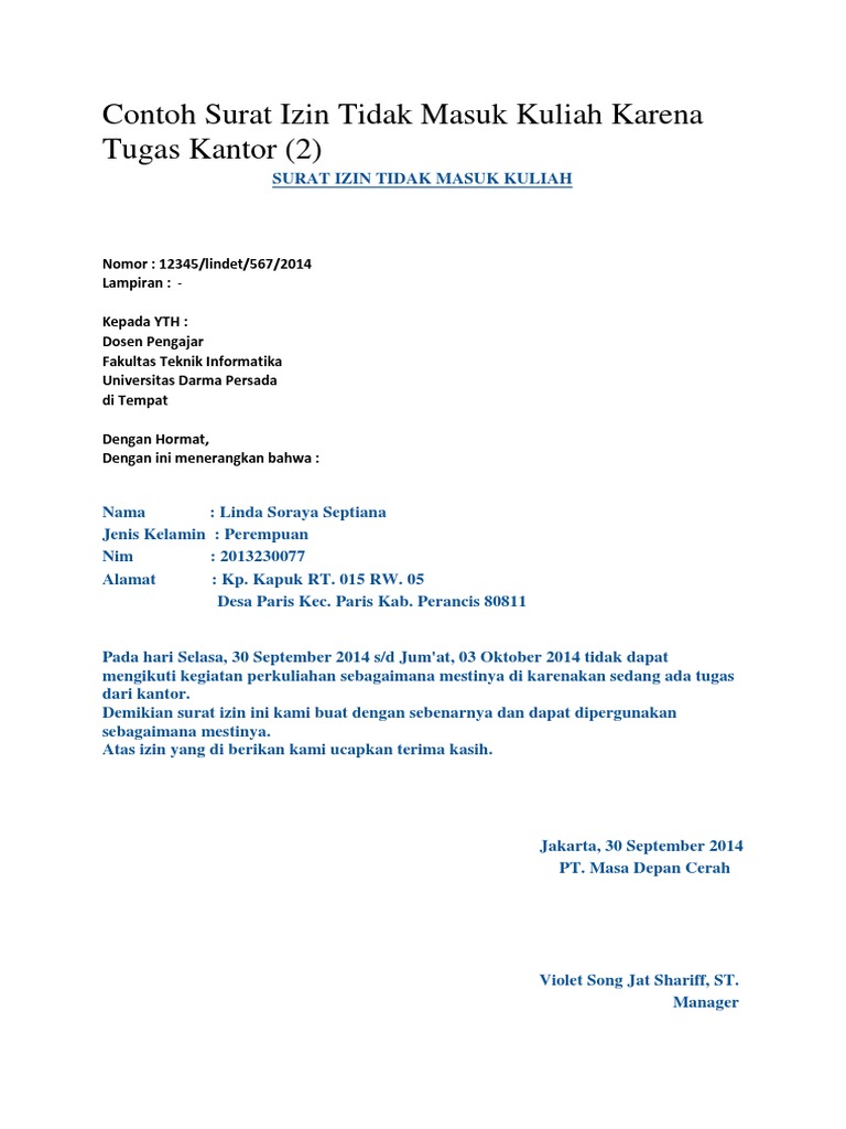 Dosen mata kuliah statistika dasar universitas brawijaya jalan raya veteran malang. Ayu widiawati nim. Contoh surat izin tidak masuk kuliah terima kasih saya ucapkan kepada para pembaca yang sudah mau meluangkan waktunya untuk mengunjungi situs ini. Asal tak bolos atau tidak masuk lebih dari empat kali di tiap mata kuliah maka mereka merasa aman. Download contoh surat izin todak masuk kuliah doc. Sekian penjelasan mengenai surat izin kuliah pada kali ini.