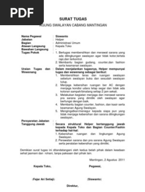 15 contoh surat tugas resmi yang baik dan paling lengkap salah satu jenis surat yang sangat sering digunakan oleh perusahaan maupun instansi tertentu adalah surat tugas. Disini kami akan bahas seputar surat tugas mulai dari pengertian hingga contoh surat tugas yang baik dan benar. Contoh surat tugas surat perintah tugas terima kasih kepada para pembaca yang telah mengunjungi situs kami. Pengertian surat tugas seperti kita tahu dalam dunia kerja banyak sekali macam macam surat salah satunya adalah surat tugas. Contoh surat keterangan kerja surat keterangan kerja di gunakan oleh karyawan atau seseorang yang memiliki ikatan kerja untuk memberikan penjelasan atau informasi bahwasanya kita adalah sebagai pekerja dan sedang bekerja dengan ini kita akan mendapatkan sebuah konfirmasi baik terhadap orang yang bersangkutan dengan kita. Surat ini sangat penting dan diperlukan sebagai keterangan ketika pegawai melakukan perjalanan dinas atau keprluan perusahaan.