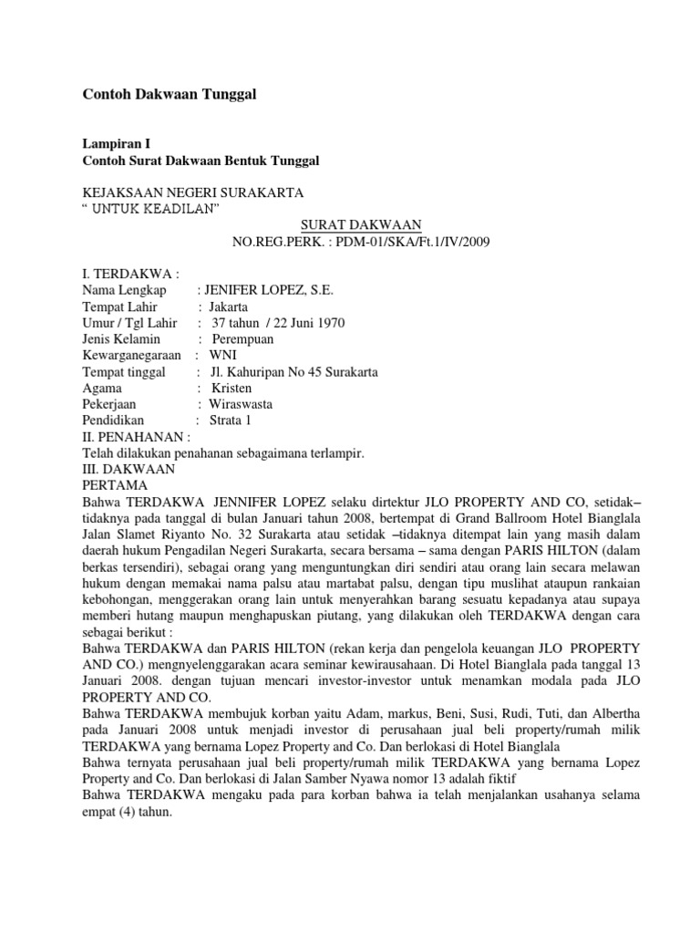 Contoh surat tuntutan kejaksaan negeri maumere. Home surat pernyataan contoh surat dakwaan tunggal berbagai kasus contoh surat dakwaan tunggal berbagai kasus surat dakwaan tunggal adalah surat yang menyatakan atau menerangkan hanya satu tindak pidana saja yang didakwakan karena tidak terdapat kemungkinan untuk mengajukan alternatif atau dakwaan pengganti lainnya. Penasehat hukum yang kami hormati hadirin yang kami muliakan. Perkenankanlah kami mengajak para hadirin untuk memanjatkan rasa pujian syukur kehadirat tuhan yang maha esa. Surat tuntutan pidana reg. Contoh surat kuasa pidana kantor advokat dan konsultan hukum ria rachman rr dan rekan jl.