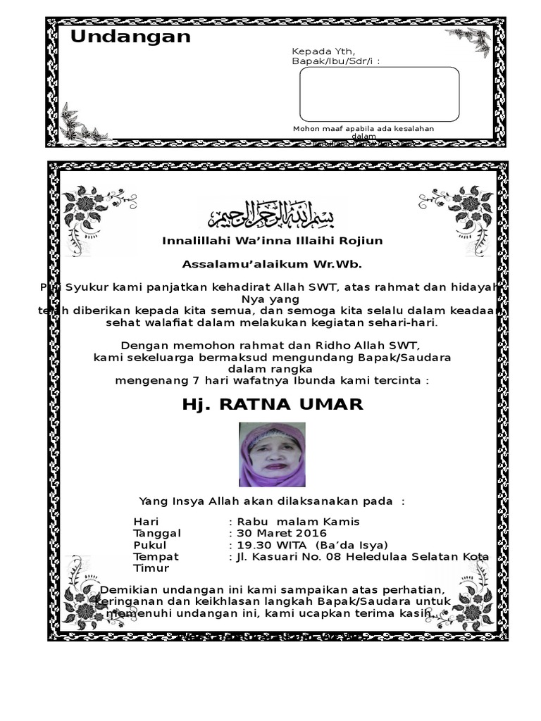 Contoh surat undangan tahlil. Contoh undangan tahlil tahlilan yasinan 3 hari. Download contoh surat undangan tahlilan siap edit file doc untuk anda yang tinggal di indonesia khususnya di pulau jawa pastinya tidak asing dengan yang namanya tahlilan. Adapun budaya tahlilan yang ada di jawa bukanlah hal wajib untuk di laksanakan oleh umat muslim mengingat rasullallah saw tidak pernah bersabda bahwa setelah. Tahlilan adalah salah satu bentuk kolaborasi budaya dan agama. Silahkan dicermati kalimat dan kalimat undangan tahlil berikut inijika ada sesuatu yang mengganjal dalam contoh surat silahkan komentari di kolom komentar yang ada di bawah. Contoh surat undangan tahlil 40 100 1000 hari.