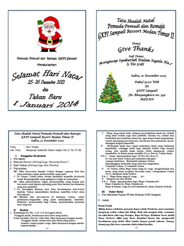 Karena pentingnya susunan acara dalam ibadah kesempatan kali ini akan diberikan contoh susunan cara natal. Perayaan natal bersama dpa tg elshadday sejahtera paud komunitas pendengar radio sejahtera group. Itulah contoh desain atau susunan liturgi natal di tempat gereja saya. Susunan acara ini akan menjadikan patokan acara dalam beribadah. Pembukaan opening atau membuka acara merupakan salah satu tugas pokok pembawa acara atau master of ceremony. Susunan acara ibadah perayaan natal congregational theater center youth of kgpm ucapan selamat datang doa pembukaan pembacaan puisi pementasan teater 1 adam hawa nabi nabi pemasang lilin pelayanan firman.