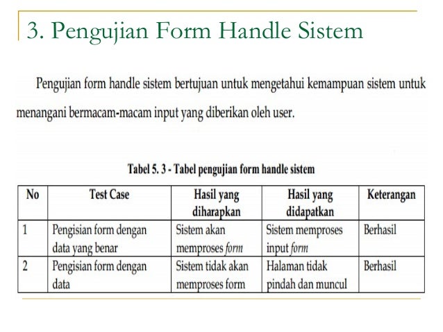 Contoh tabel pengujian black box testing. White box testing adalah oleh dosenpendidikan diposting pada 30042020 white box testing pengertian persyaratan jenis kelebihan kekurangan pengujian contoh untuk pembahasan kali ini kami akan mengulas mengenai white box testing yang dimana dalam hal ini meliputi pengertian. Berdasarkan penjelasan diatas dapat kita simpulkan bahwa pengujian ini menggunakan kuisioner yang di berikan terhadap penggunanya untuk mengetahui apakah sistem yang dibuat sudah layak digunakan apa belum. University of sanata dharma. Black box testing technique focuses on the domain information of the software by doing a test case to partition the input domain of a program in a way. Implementasi program sistem monitoring inventory control pada asuransi jiwa bersama ajb bumiputera dilakukan dengan menggunakan metode black box testingmetode black box testing merupakan pengujian program yang mengutamakan pengujian terhadap kebutuhan fungsi dari suatu programtujuan dari metode black box testing ini adalah untuk menemukan kesalahan fungsi pada programpengujian dengan. Black box testing adalah pengujian yang dilakukan hanya mengamati hasil eksekusi melalui data uji dan memeriksa fungsional dari perangkat lunak.