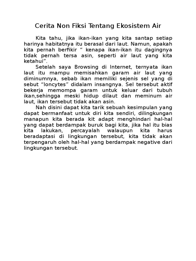 Contoh teks non fiksi. Demikian artikel tentang pengertian teks cerita fiksi struktur teks unsur dan kaidah teks cerita fiksi lengkap semoga dapat memperkaya wawsan anda. Selain itu cerita fiksi bisa dikaitkan dengan kejadian kehidupan nyata. Contoh cerita fiksi merupakan cerita rekaan fantasi bukan cerita kejadian asli atau keadaan yang sebenarnya. Non fiksi murni adalah cerita ini memiliki isi yang menurut pengembangan yang di dasari dari data data otentik. Semoga dapat bermanfaat dan dapat menambah wawasan kamu tentang bagaimana caranya meresensi buku non fiksi yang baik dan benar. Non fiksi kreatif adalah cerita berisi sebuah data real yang di kembangkan menjadi sebuah imajinasi dala bentuk karangan tertentu seperti novel puisi dan sebuah prosa.