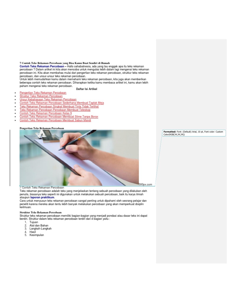 Contoh teks rekaman percobaan ilmiah. Pengertian teks rekaman percobaan. Teks rekaman percobaan adalah teks yang menjelaskan tentang sebuah percobaan yang dilakukan oleh penulis biasanya teks seperti ini digunakan untuk melakukan sebuah percobaan baik itu karya ilmiah ataupun laporan praktikum. Berhubungan teks rekaman percobaan hampir mirip dengan teks prosedur alangkah baiknya kita tahu perbedaan antara keduanya. 1 juni 2020 7 min read. Teks rekaman percobaan adalah bentuk teks yang di bagian dalam teksnya berisi mengenai tentang percobaan eksperimen yang dilakukan si penulis teks tersebut teks rekaman percobaan. Teks rekaman percobaan merupakan teks yang berisi tentang percobaan yang telah dilakukan oleh seseorang.