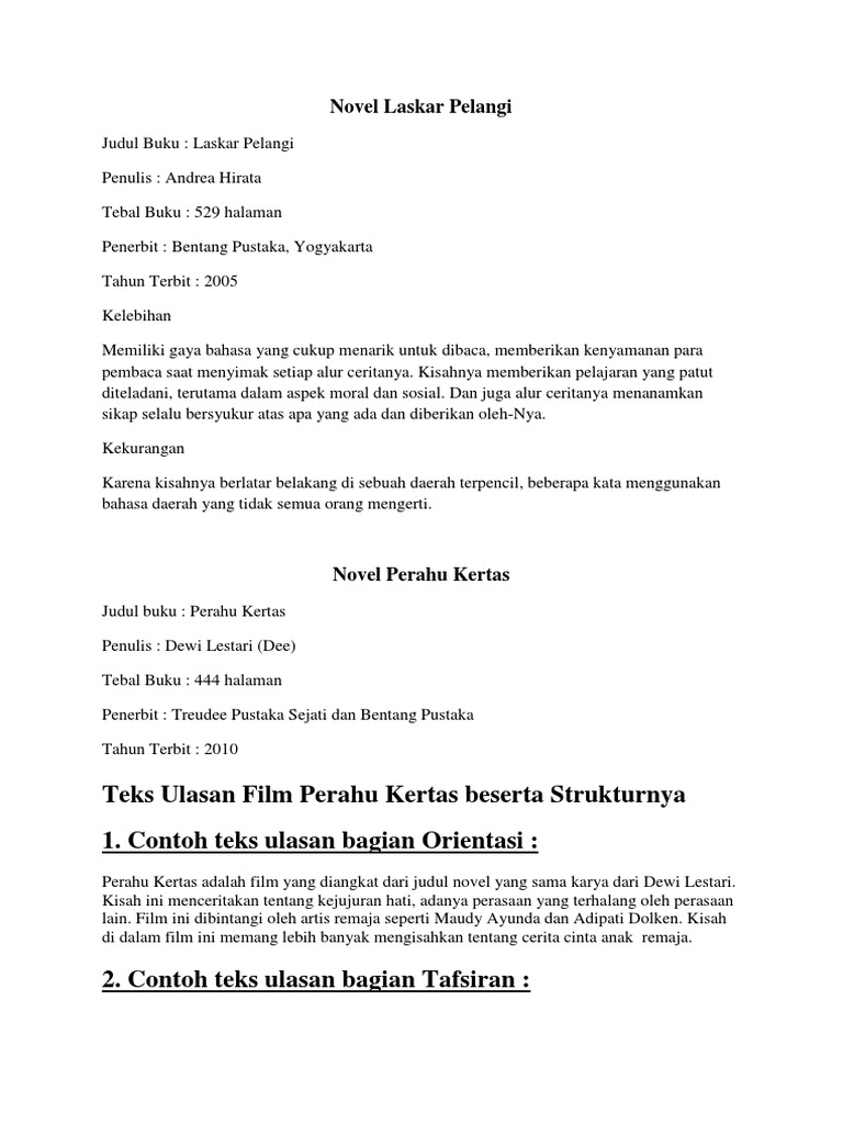 Contoh teks ulasan novel beserta strukturnya. Teks ulasan tidak jauh berbeda dengan teks teks lainnya yang sama sama memiliki struktur. Pengertian teks ulasan contoh ciri tujuan struktur dan kaidahnya sebagai insan akademik kita tentu harus membaca karya karya ilmiah antara lain buku. Contoh teks ulasan film 5 cm singkat beserta dengan strukturnya written by ivanwira sunday march 5 2017 add comment semuacontoh yoo para pembaca dan pelajar kali ini saya akan membagikan contoh singkat teks ulasan film indonesia 5 cm yang merupakan salah satu materi pembelajaran bahasa indonesia yang mungkin teman teman butuhkan untuk referensi mengerjakan tugas. Berisi contoh teks ulasan singkat beserta strukturnya. Berikut ini adalah contoh teks ulasan yang baik dan benar. Kumpulan contoh teks ulasan cerpen singkat salah satunya bertema persahabatan teks ulasan film terbaru novel dan buku beserta strukturnya.