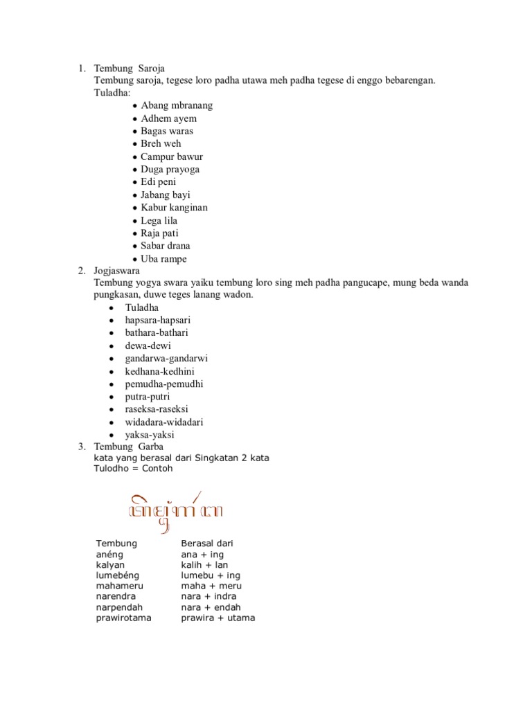 Nah pada kesempatan kali ini kita akan mengulas secara lengkap mengenai tembung entar. Jadi agar tidak bingung coba lihat beberapa contoh ukara menggunakan tembung garba di bawah ini. Katon dhadhane wani adu arep 07. Contoh tembung dalam bahasa jawa ada tembung saroja tembung bebasa tembung parikan tembung saloka dan lain sebagainya. Contoh tembung saroja dan artinya misalnya sulaimin numpak motor tibo raine babak bundas arti kalimat tersebut yaitu sulaimin motor kemudian jatuh wajahnya babak belur. Kasar tembunge tembung saru 06.