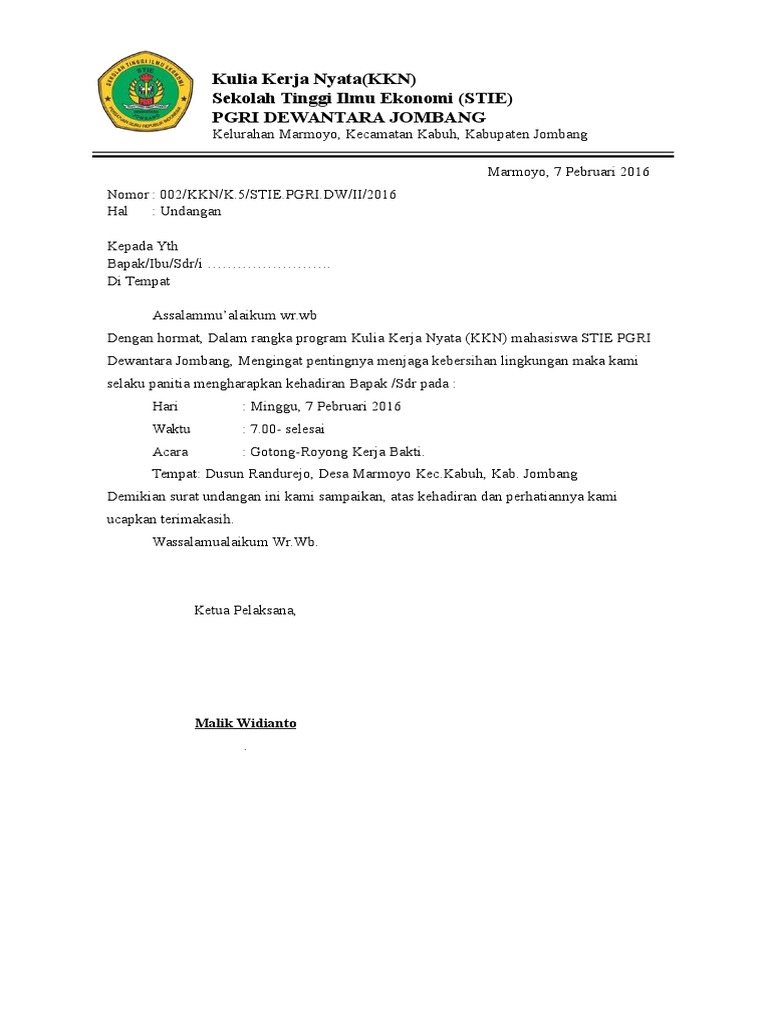 Salah satu surat resmi yang sering kali kita temui adalah surat undangan kerja bakti dari rt. Pemerintah kabupaten batang kecamatan kandeman desa sukuh rt02 rw04 dukuh cetho bleder 28 oktober 2015. Untuk lebih jelasnya berikut belajar office berikan. Selanjutnya yaitu ketika akan mengadakan kegiatan sebagai contoh kerja bakti biasanya ketika akan melakukan kegiatan tersebut untuk lebih formalnya ketua rt akan diberikan surat undangan kerja bakti. 15 contoh surat edaran paling lengkap yang baik dan benar surat merupakan sebuah media komunikasi yang sudah digunakan sejak lama. Berikut contoh surat undangan rapat untuk kerja bakti tersebut.