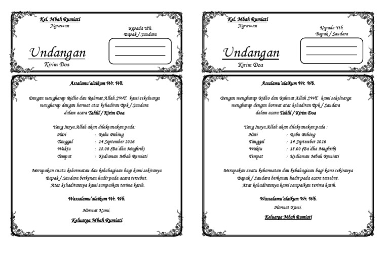 Berikut ini contoh undangan kirim doa yasin dan tahlil memperingati 40 hari 100 harri 1000 hari dan pendak 1 tahun dokument word di bawah ini tinggal mengganti acara nama hari tanggal saja sesuai dengan yang punya hajad. Untuk membuat contoh surat undangan tahlil 40 100 1000 hari haul ini lebih menarik ts udah nambahin border dan sedikit hiasan di sudutnya cek preview nya gan. Undangan tahlilan kirim doa terkait. Berikut ini contoh undangan kirim doa yasin dan tahlil memperingati 40 hari 100 harri 1000 hari dan pendak 1 tahun dokument phrase di bawah ini tinggal mengganti acara nama hari tanggal saja sesuai dengan yang punya hajad. Contoh undangan 1000 hari. 1undangan kirim doa model 1 folio 2 undangan.