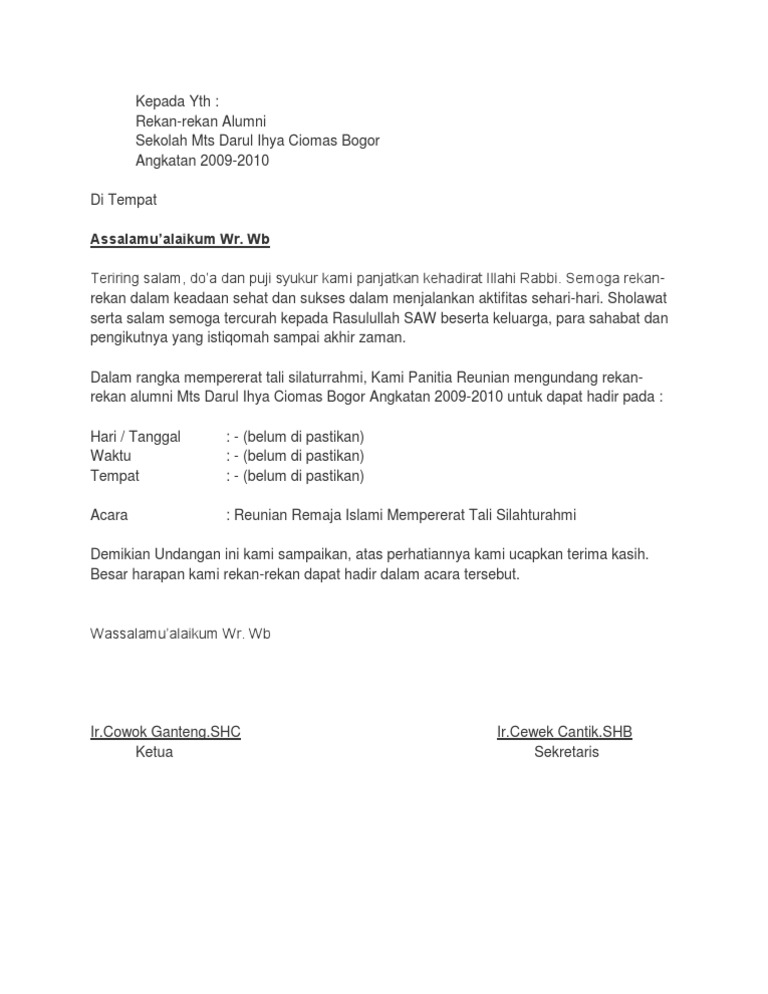 Memang dikala kita masih di bangku sekolah itu sangat menyenangkan bisa setiap hari bertemu bisa main dan bersenda gurau bersama bahkan menjaili kawan. Dan untuk mempererat tali silaturahmi persahabatan diantara semua teman kami ingin mengadakan acara reuni alumni smp n 2 banjarsari angkatan 2008 pada. Masih banyak kenangan yang tersisa. Contoh surat undangan pengajian contoh surat undangan pengajian. Mohon maaf apabila banyak kesalahan baik dalam penulisan ataupun yang lainnya. Contoh undangan reuni smpsma.
