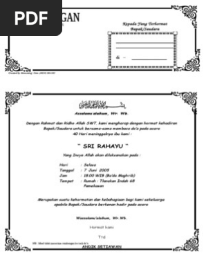Contoh undangan tahlil 40 hari yang bisa di edit. Admin rasa cukupkan dulu informasi mengenai undangan tahlil kali ini admin doakan semoga arwah yang telah meninggal diterima dan mendapatkan tempat terbaik di sisinya. Kegiatan tahlilan merupakan acara selamatan yang dilakukan oleh sebagian umat muslim di indonesia yang tidak lain bertujuan untuk mengenang dan mendoakan orang yang telah meninggalwafat. Tahlilan adalah salah satu bentuk kolaborasi budaya dan agama. Unduh format undangan tahlil 40 hari kata microsoft 40 hari undangan biasanya dilakukan setelah sebelumnya melakukan 7 hari meniggalnya almarhum boleh dipasing setiap daerah ada yang melakukannya juga tidak ada. Adapun budaya tahlilan yang ada di jawa bukanlah hal wajib untuk di laksanakan oleh umat muslim mengingat rasullallah saw tidak pernah bersabda bahwa setelah. Download contoh surat undangan tahlilan siap edit file doc untuk anda yang tinggal di indonesia khususnya di pulau jawa pastinya tidak asing dengan yang namanya tahlilan.