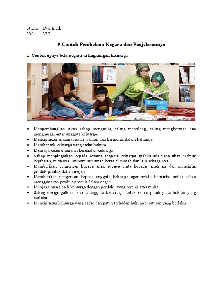 Membentuk keluarga yang sadar hukum. Contoh upaya bela negara yang bisa dilakukan pelajar adalah belajar dengan tekun di sekolah. Seorang siswa ikut ulangan umum di sekolahnya. Contoh upaya bela negara di lingkungan keluarga sekolah masyarakat dan negara sebelumnya juga sudah dibahas mengenai contoh upaya bela negara yang dilakukan oleh tni polri dan rakyatwarga negara dalam artikel yang berjudul partisipasi dalam usaha pembelaan negara. Sebelum kemerdekaan setelah kemerdekaan 2. Di rumah seorang pelajar harus menghormati orang tua serta lingkungan sekitarnya.
