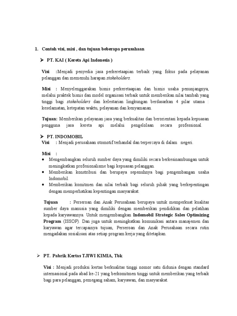Contoh visi misi dan tujuan perusahaan. Sedangkan misi adalah aktivitas yang dilakukan oleh perusahaan sebagai alat untuk mencapai tujuan perusahaan. Yang berisi tentang pemikiran para pendiri organisasi. Visi misi dan core values dalam bisnis lihat juga. Visi adalah rangkaian kata yang didalamnya terdapat impian yang harus dicapai cita cita termasuk inti dari suatu organisasi. Karena keduanya adalah faktor kunci dalam mempertahankan bisnis. Sebuah perusahaan yang besar pastilah memiliki visi jangka panjang serta misi utama yang kuat.