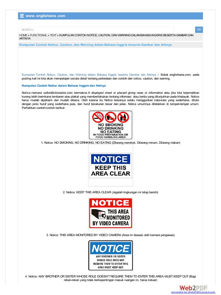 Serta bisa diambil pelajaran cara memaknai notice. Contoh caution notice dan warning teks fungsional pendek caution notice dan warning berfungsi untuk mengingatkan seseorang agar tidak melakukan sesuatu menyuruh seseorang melakukan sesuatu sesuai aturan dan memperingatkan seseorang untuk menghindari sesuatu agar tidak terjadi sesuatu yang tidak diharapkan. Dan contoh notice bahasa inggris di bawah ini dapat menjadi gambaran bagaimana membuat notice yang baik. Berikut ini contoh teks fungsional pendek berbentuk caution notice dan warning.