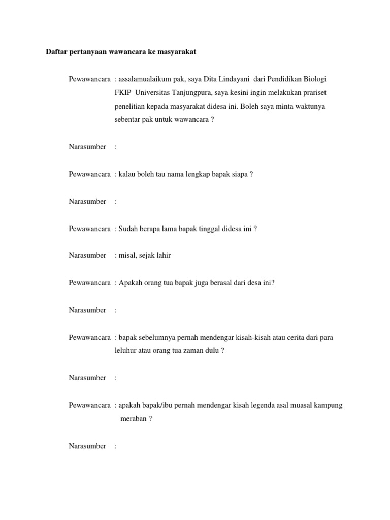 Dalam hal ini pewawancara bertugas untuk menggali informasi sedalam dalamnya berkaitan dengan tema yang diusung dalam kegiatan ini. Contoh laporan hasil wawancara laporan hasil wawancara adalah sebuah teks tertulis yang melaporkan suatu wawancara yang telah dilakukan baik itu wawancara dengan pedagang pengusaha guru ketua rt.